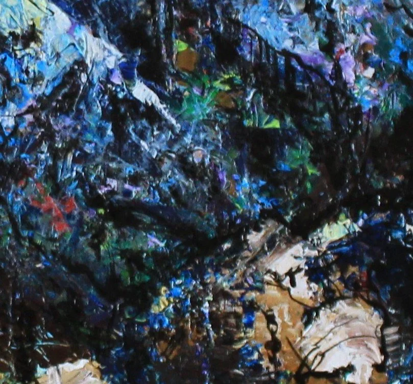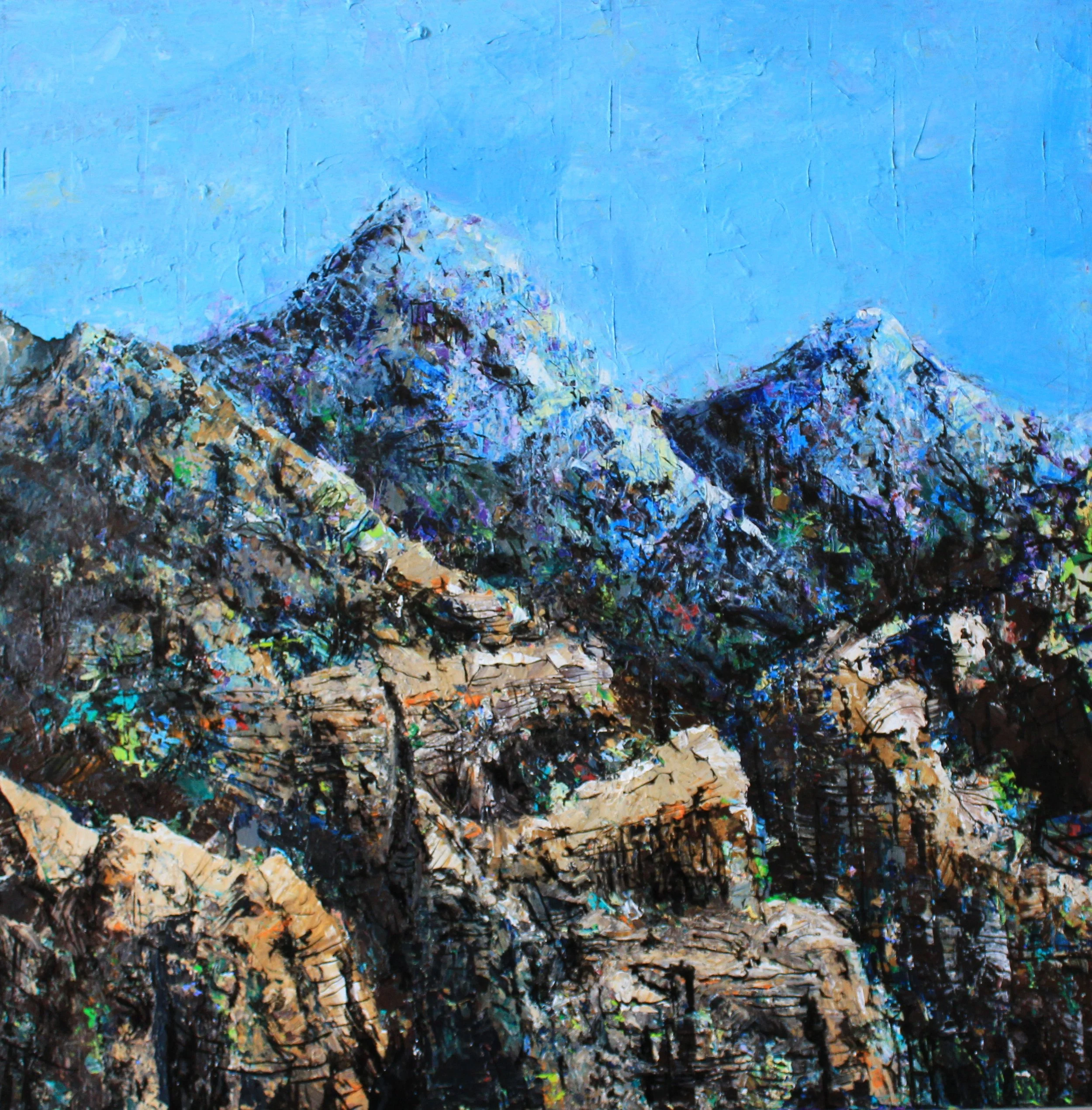 The rugged structures, the contrasting colours and textures enable the painting and drawing techniques I most enjoy. Multiple layers, textures, lines, patterns. Applying the layers with painting knives, large and fine brushes, scratching, applying, removing, re-applying, scraping. All done with energy, and both heavy and lightness of touch.